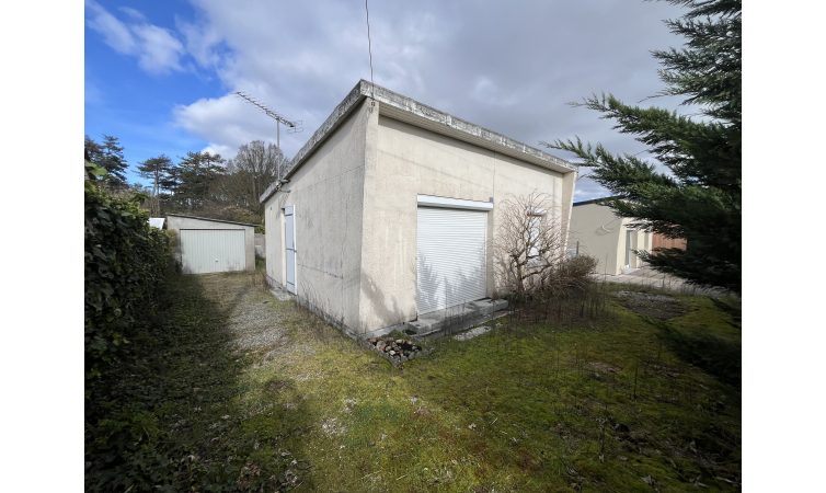 Maison de plain-pied de 47 m² compr. : Cuisine, couloir, salle d’eau, WC, séjour, deux chambres. Garage et terrain clos de 130 m².
